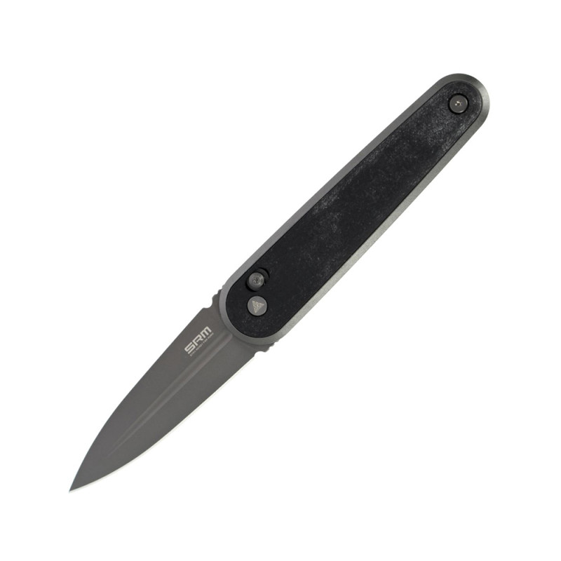 Couteau SRM 251M-GB, de forme de lame spear point, avec manche en micarta noir. Ce couteau se verrouille et déverrouille via un système de cross bar lock, garantissant une fiabilité de mécanisme, sans risque que la lame se referme accidentellement. La lam